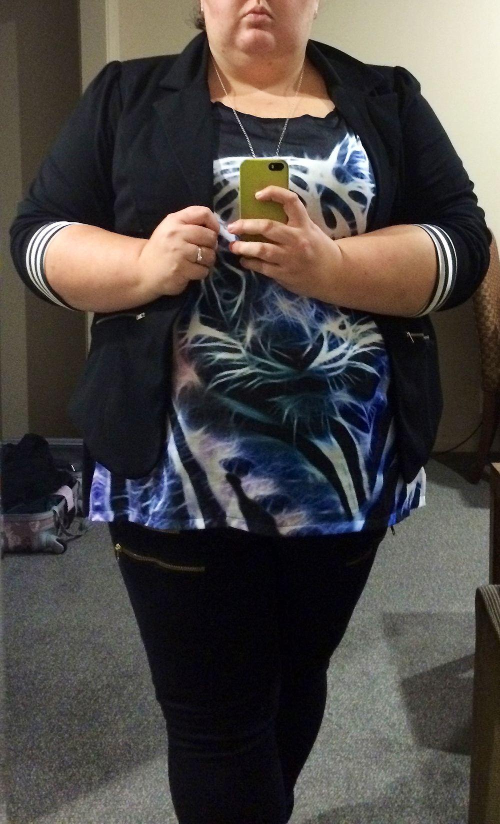 I love this tiger top. So much that I have managed to now own four tops that are similar. Which is what this post is all about – the tops that save me time. They are made up of two different materials. The front is a patterned, silk-like material, while the back is black and stretchy. I usually pair them with jeans, my black blazer and a pair of flats. Done.