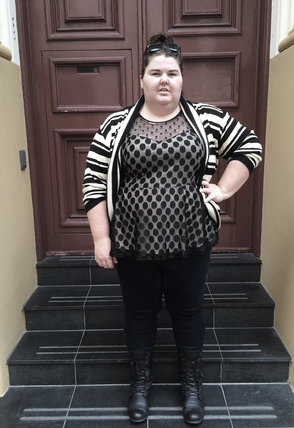 I started to think I did not have anything else that had polka dots on it and I was very near sitting this week of Aussie Curves out, but, in a last ditch attempt, I went through every single piece of clothing which is currently resident of my apartment and I found a polka dot peplum top.