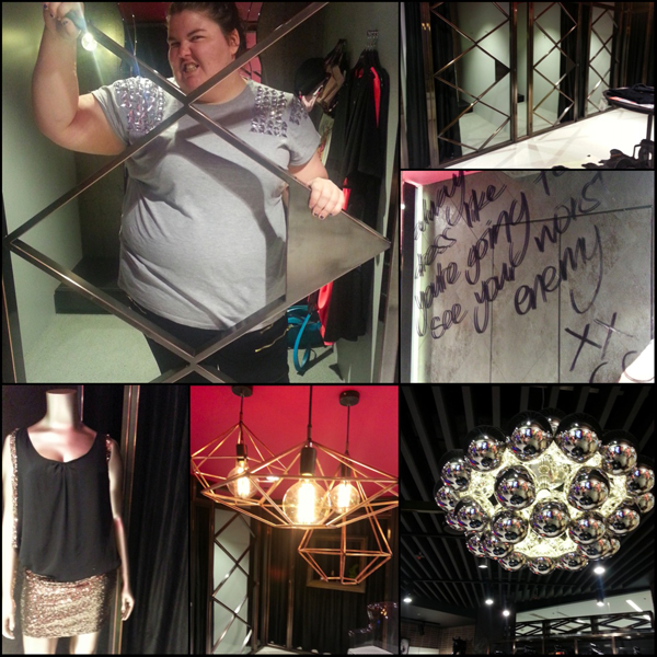 The Styling Lounge has awesome steel gates on the changing rooms with a decent thick curtain that pulls across as well, so you are assured privacy while changing. The above picture shows these gates and the few lampshades throughout the store. The quote on the mirror entering the lounge says, “Always dress like you’re going to see your worst enemy.”
