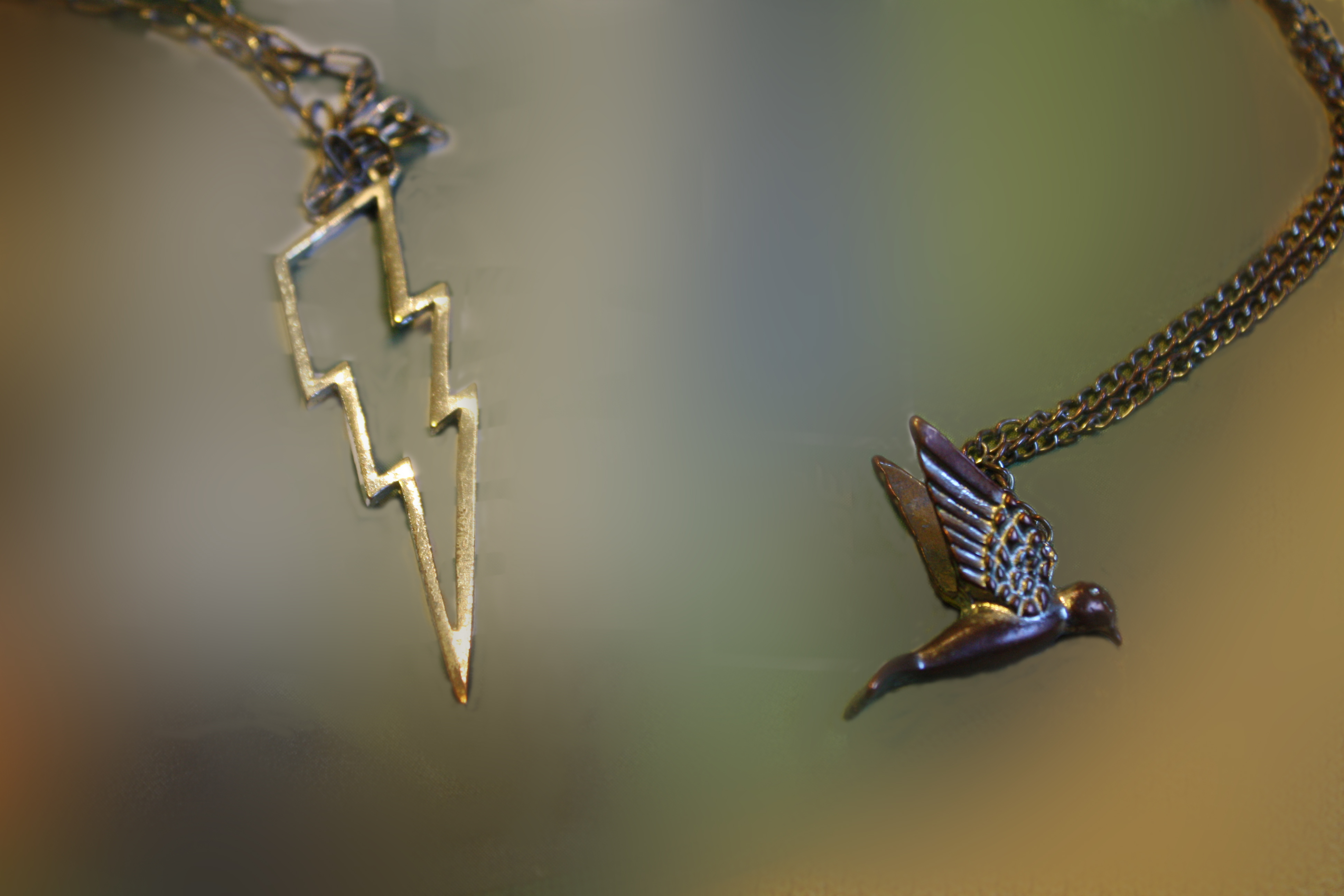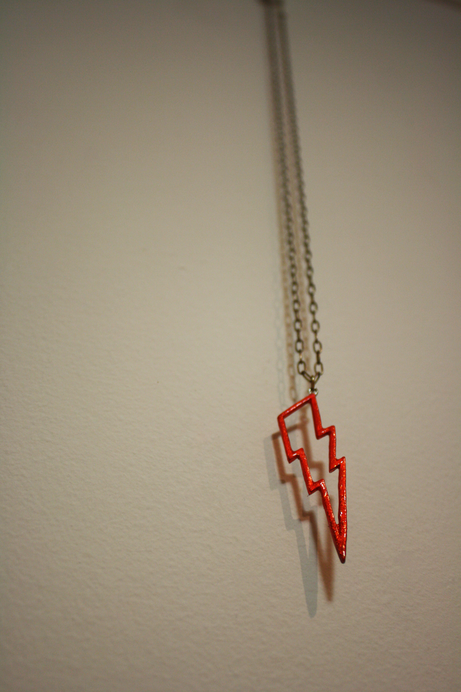 The lightning bolt necklace after my re-fashion. I just painted it with nail polish. This colour is ‘Riveting’ by China Glaze from the Hunger Games Collection. Definitely the right colour for a lightning bolt.